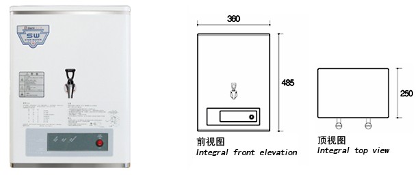 外形尺寸(長X深X高):360×250×485mm 額定功率:3KW 額定電流:13.6A 額定電壓(AC):220V 推薦電源:16A插座 容??? 積:15L 連續供開水量(5磅暖瓶):6